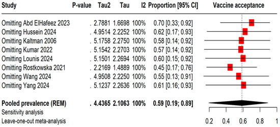 Leave-one-out sensitivity analysis of Mpox vaccine acceptance among students [13,20,21,22,23,24,25,26].