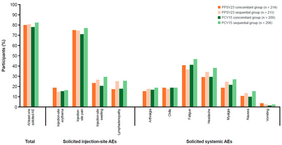 The proportions of participants with systemic AEs were generally comparable between the PPSV23 concomitant (57.9%) and sequential (54.2%) groups, and between the PCV15 concomitant (53.1%) and sequential (54.2%) groups. The proportions of participants with vaccine-related systemic AEs were similar between the PPSV23 concomitant (55.6%) and sequential (51.2%) groups, and between the PCV15 concomitant (53.1%) and sequential (59.6%) groups, following any vaccination. The incidence of SAEs was low in both the PPSV23 (<1%) and PCV15 (<3%) groups, and none were considered by the investigator to be related to study vaccine.