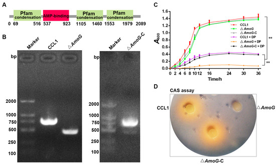 The strains CCL1, ΔAmoG, and ΔAmoG-C were cultured in LB broth at 28 °C for 24 h. Scanning electron microscopy was employed to assess cell morphology. Growth dynamics were monitored by cultivating the strains in LB with or without 100 μM 2, 2′-dipyridyl (Dp), starting at an A600 of 0.01; samples were taken at various intervals to measure A600. Motility assays and biofilm formation tests were conducted according to Reference [16]. The Chrome Azurol S (CAS) plate assay and Arnow’s test were used to analyze siderophore production according to Reference [20]. Each assay was replicated three times.