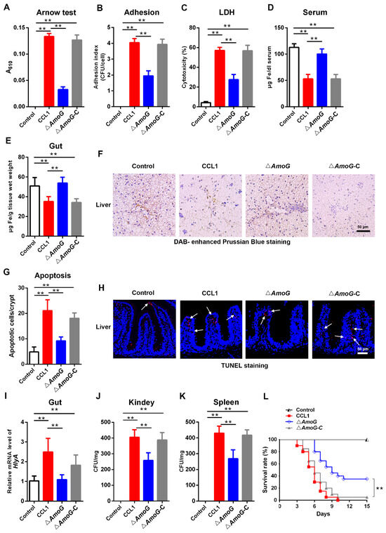 Effect of AmoG on bacterial infection. (A) An Arnow assay was used to analyze the production of amonabactin in Aeromonas hydrophila CCL1, ΔAmoG, and ΔAmoG-C. Caco-2 cells were challenged with CCL1, ΔAmoG, ΔAmoG-C, and PBS (control) for 1 h, and their (B) adhesion index and (C) cytotoxicity were determined. Crucian carps were challenged with CCL1, ΔAmoG, ΔAmoG-C, or PBS (control) for 24 h. Iron contents in the (D) serum, (E) distal gut, and (F) liver were analyzed. (G,H) The apoptotic cells in the distal guts of infected fish were examined using a TUNEL analysis. White arrow indicates apoptotic cells. The bacterial burdens in the distal guts (I), kidneys (J), and spleens (K) were measured. Values are Means ± SEM (N = 3). Mann–Whitney test. ** p < 0.01. (L) Survival curves. Fish infected with CCL1, ΔAmoG, ΔAmoG-C, and PBS (control) were monitored over two weeks. Log-rank test (p < 0.01).