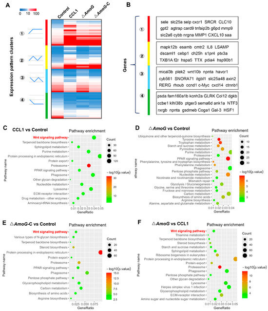 Transcriptomic impact of AmoG on the distal gut during Aeromonas hydrophila infection. Crucian carps were challenged with A. hydrophila CCL1, ΔAmoG, ΔAmoG-C, or PBS (control) for 24 h, and a transcriptomic analysis of their distal gut was performed. (A) Heatmap representations of differentially expressed genes upon infection with CCL1, ΔAmoG, ΔAmoG-C, or PBS. Clustering reveals the genes sharing the same expression trends. Mann–Whitney test, p < 0.01. (B) Highlighted genes exhibiting notable expression changes within identified clusters. (C–F) KEGG pathway enrichment analysis identifying the Wnt signaling pathway as being significantly affected during A. hydrophila infection.