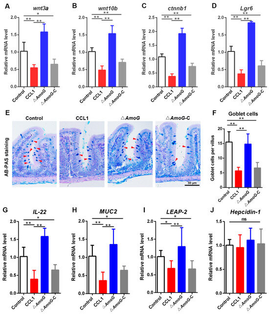 Effect of AmoG on goblet cells and antimicrobial molecules in the distal gut. Crucian carps were challenged with Aeromonas hydrophila CCL1, ΔAmoG, ΔAmoG-C, or PBS (control) for 24 h. (A–D) The expression of wnt3a, wnt10b, ctnnb1, and Lgr6 in the distal guts was analyzed by qRT-PCR. (E,F) AB-PAS staining was used to show the goblet cells in the distal guts. Red arrow indicates goblet cells. Bar: 50 μm. (G–J) The expression of antimicrobial genes in the distal guts was analyzed by qRT-PCR. Values are Means ± SEM (N = 3). Mann–Whitney test. * p < 0.05; ** p < 0.01; ns: no significance.