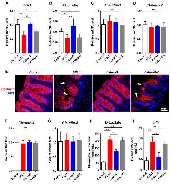 Effect of AmoG on the gut mucosa barrier. Crucian carps were challenged with Aeromonas hydrophila CCL1, ΔAmoG, ΔAmoG-C, or PBS (control) for 24 h. The expression of (A) ZO-1, (B) Occludin, (C) Claudin-1, (D) Claudin-2, (F) Claudin-4, and (G) Claudin-8 in the distal guts was determined by qRT-PCR. (E) Immunohistochemistry demonstrates Occludin’s distribution in the distal guts. White arrow indicates the location of Occludin. Gut permeability was measured by (H) plasma D-lactic acid and (I) LPS levels. Values are Means ± SEM (N = 3). Mann–Whitney test. * p < 0.05, ** p < 0.01. ns: no significance.