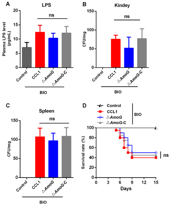 Fish (twenty fish in each group) were injected i.m. with 100 µL of the Wnt/β-catenin agonist BIO (0.5 mg/mL, Sigma, St. Louis, MO, USA). Two hours following the initial procedure, each fish received an intramuscular injection comprising 100 µL of suspension, with concentrations of 1 × 106 CFU/mL for either CCL1, ΔAmoG, ΔAmoG-C, or PBS. At 24 hpi, the kidney, spleen, and blood from CCL1-, ΔAmoG-, ΔAmoG-C-, or PBS (control)-injected fish were carefully sampled as above. Plasma LPS levels, bacterial dissemination, and survival rate assays were determined as reported above. Each assay was replicated three times.