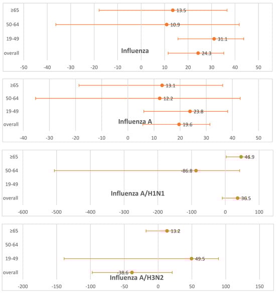 8. Domnich, A.; Orsi, A.; Ogliastro, M.; Trombetta, C.-S.; Scarpaleggia, M.; Stefanelli, F.; Panatto, D.; Bruzzone, B.; Icardi, G. Influenza vaccine effectiveness in preventing hospital encounters for laboratory-confirmed infection among Italian adults, 2022/23 season. Vaccine 2023, 41, 4861–4866. [Google Scholar] [CrossRef] [PubMed]