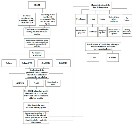 Protein Data Bank (PDB; http://www.rcsb.org/pdb/home/home.do, accessed on 20 December 2021) was utilized for obtaining the 3D structures of FcγRIII (CD16) and the SARS-CoV-2 Spike protein. The National Center for Biotechnology Information (NCBI) Gene portal was searched and used for the protein sequence of ACE2. A literature search defined the amino acid residues of its soluble form [30,31,32]. A separate literature search was carried out with the aim of finding potential liner peptides [33,34,35,36,37,38]. Since the CD16-specific VHH was a novel single-domain antibody fragment previously isolated from an immune VHH library, various in silico techniques used for the engineering of VHHs were taken into consideration [39,40]. Also, whether the VHH should be linked to the soluble ACE2 protein through its N-terminus or C-terminus was assessed in in silico experiments.