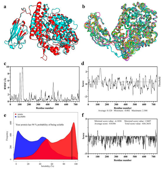 Energy minimization, flexibility assessment, antigenicity, and the solubility profile of VHH-GGGGS3-ACE2. (a) The structural alignment of the energy-minimized VHH-GGGGS3-ACE2 with its native counterpart. The structure depicted in cyan shows VHH-GGGGS3-ACE2 before energy minimization, and the structure in red shows VHH-GGGGS3-ACE2 after energy minimization. (b) Evaluation of the flexibility of VHH-GGGGS3-ACE2 by the CABS-flex 2.0 server. Ten structures predicted during the flexibility are presented in different colors (in the ribbon presentation). (c) The RMSF plot of VHH-GGGGS3-ACE2. (d) The Bepipred Linear Epitope Prediction results with the threshold set at 0.350. (e) The solubility propensity of VHH-GGGGS3-ACE2, as assessed by ccSol omics. (f) The solubility profile of VHH-GGGGS3-ACE2 as predicted by the Aggrescan3D server.
