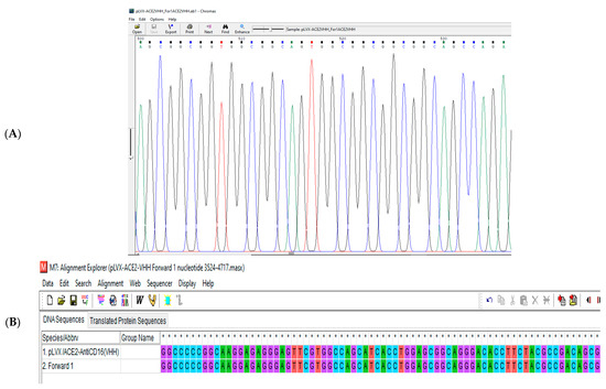 (A) A part of the sequencing result of pLVX/sACE2-AntiCD16VHH using forward primer 1. (B) A part of the sequence alignment of the pLVX/sACE2-AntiCD16VHH using forward primer 1. The result showed that nucleotides 3524 to 4717 are completely correct and without any mutations. * GGCC are nuclei symbols.