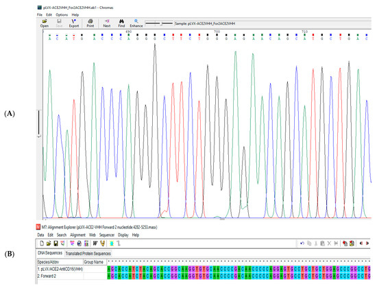 (A) A part of the sequencing result of pLVX/ACE2-AntiCD16(VHH) using forward primer 2. (B) A part of the sequence alignment of the pLVX/ACE2-AntiCD16(VHH) using forward primer 2. The result showed that nucleotides 4282 to 5282 are completely correct and without any mutations. * GGCC are nuclei symbols.