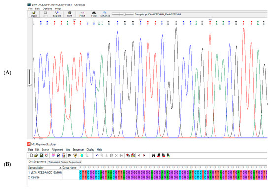 The pLVX/sACE2-AntiCD16VHH was sent to the Gen Fanavaran company for sequencing by the specific primers. The sequencing results were then aligned against the original sequence using MEGA 6.0. The result confirmed that the sequence of the construct was accurate and without any mutations (Figure 9, Figure 10 and Figure 11).