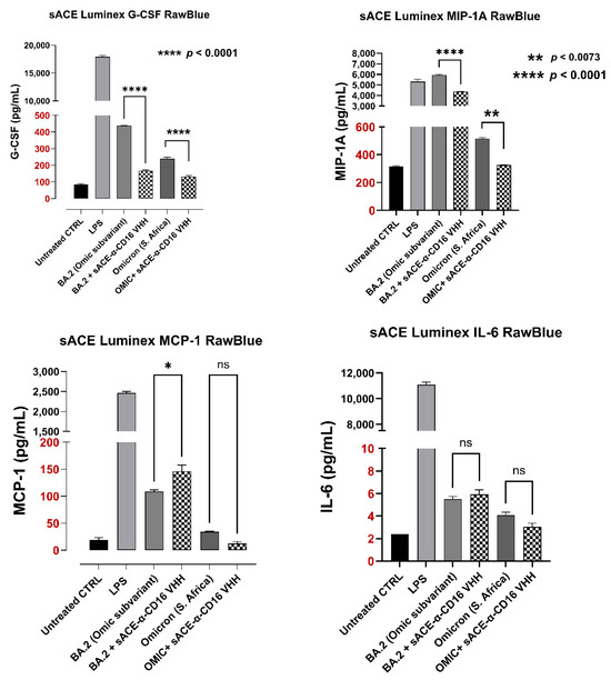 Effect of sACE2-AntiCD16VHH fusion protein on the inflammatory cytokine response induced by the Omicron and BA.2 variants of SARS-CoV-2 spike S proteins using the MILLIPLEX® Luminex® xMAP® cytokine assay. Data represent the mean ± SEM of 3 separate, independent experiments performed in triplicate, displaying similar results. As indicated by asterisks, statistical significance was calculated with ANOVA and Fisher’s uncorrected LSD post hoc test at a confidence level of 95%. ns = non-significant, **** p < 0.0001, ** p < 0.01, * p < 0.05.