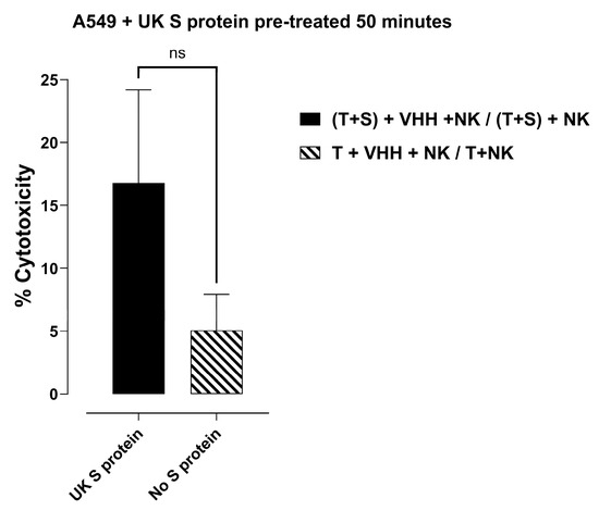 MACS separated human NK cells and ACE-2+ A549 target cells were co-cultured with sACE2-AntiCD16VHH fusion protein with or without (control) SARS-CoV-2 S protein (UK variant), and the NK cytotoxicity was measured by Alamar Blue colorimetric assay after 4 h. T, A549 cell; S, UK S-protein (alpha); VHH, sACE2-α-CD16 (3.4 μg/mL). Data represent the mean ± SEM of 2 separate, independent experiments performed in duplicate. As indicated, statistical significance was calculated with ANOVA and Fisher’s uncorrected LSD post hoc test at a confidence level of 95%. ns = non-significant, (p = 0.1389).