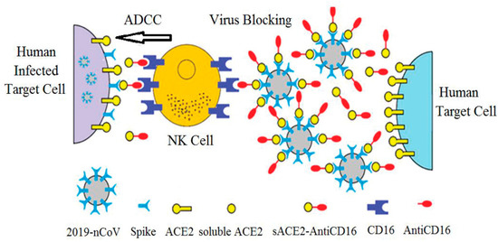 - Sheikhi, A.; Hojjat-Farsangi, M. An immunotherapeutic method for COVID-19 patients: A soluble ACE2-Anti-CD16 VHH to block SARS-CoV-2 Spike protein. Hum. Vaccines Immunother. 2021, 17, 92–97. [Google Scholar] [CrossRef]