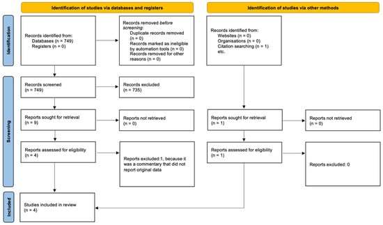 In total, 749 articles were identified from three databases: 23 from ISI Web of Knowledge, 669 from Scopus, and 57 from MEDLINE/PubMed. After removing duplicate articles across the databases and applying inclusion and exclusion criteria, five studies were considered eligible. Among the identified articles, one study was excluded because it was a commentary that did not report original data. As a result, four studies were considered eligible and met the inclusion criteria [18,19,20,21] (Table 1).