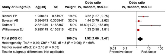 Pooled analysis. A significant relationship was evidenced between splenectomy/asplenia and overall severe COVID-19 outcomes (OR = 1.92; 95% CI = 1.06–3.47; I2 = 60.0%; p = 0.060; Figure 2). Both the sensitivity analyses considering only the general population and the studies of high quality confirmed the statistically significant relation with a lower heterogeneity (OR = 1.55; 95% CI = 1.03–2.35; I2 = 38.0%; p = 0.020). Conducting sensitivity analysis by excluding one study at a time did not reveal any significant distortion from a specific paper.