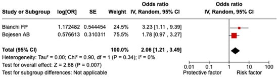 A significant relationship was evidenced between splenectomy/asplenia and COVID-19-related hospitalization (OR = 2.06; 95% CI = 1.21–3.49; I2 = 0.0%; p = 0.340; Figure 3). It was not possible to perform any sensitivity analyses due to the small number of included studies.