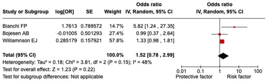 A non-statistically significant relationship was evidenced between splenectomy/asplenia and COVID-19-related death (OR = 1.52; 95% CI = 0.78–2.99; I2 = 48.0%; p = 0.150; Figure 4). It was not possible to perform sensitivity analysis for population and quality due to the similar characteristics of the included studies. Excluding one study at a time did not reveal any significant distortion from a specific paper.