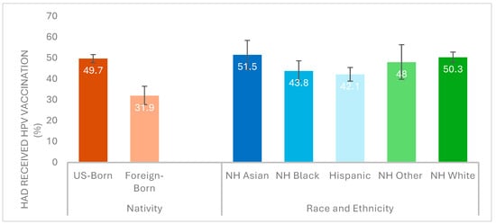 In addition to racial/ethnic disparities [26], there are known inequalities in access to preventive care services between U.S.- and foreign-born individuals [27]. Foreign-born people account for 14.4% of the US population and are the fastest growing population in the US [28]. There were over 47.8 million foreign-born individuals in the US in 2023 compared to 9.6 million in 1970 [28]. Priors studies have indicated that HPV infection is prevalent among foreign-born individuals in the US [29], and they often present with late-stage HPV-related cancers at diagnosis [30], primarily due to lack of HPV prevention knowledge and access, including HPV vaccination. Nonetheless, nativity-related HPV vaccination disparities are often masked in analyses grouping U.S. and foreign-born individuals of a given race/ethnicity within a homogenous racial/ethnic category [31]. This may hinder the determination of subgroups needing additional interventions and the development and implementation of strategic and effective interventions to reduce HPV vaccination disparities. Thus, the current study examined HPV vaccination rates among adults aged 18–26 years by race and ethnicity disaggregated by nativity status to identify subgroups that may be targeted for aggressive HPV vaccination interventions to reduce HPV-related diseases disparities.