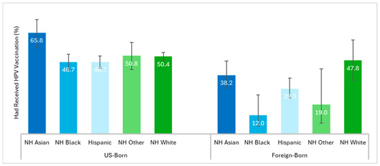 Background/Objectives: Human papillomavirus (HPV) is linked to multiple cancers that can be prevented through vaccination. While the optimal age for vaccination is in childhood and adolescence, vaccination recommendations include adults through age 26 who missed childhood/adolescent vaccination. There are limited data about disparities among adults eligible for catch-up HPV vaccination. We conducted a comprehensive examination of HPV vaccination among US young adults, disaggregating the group by race/ethnicity and nativity status to identify subgroups that may require additional interventions. Methods: We analyzed 2019 and 2022 data of individuals aged 18–26 years from the National Health Interview Survey. Generalized linear models using Poisson regression with log link were used to examine the receipt of 1+ dose of HPV vaccine, race/ethnicity, and nativity (i.e., US- versus foreign-born) status. Results: The overall receipt of 1+ doses of HPV vaccine was 47.5%. The vaccination rate among the US-born group was 49.7% versus 31.9% among the foreign-born group with an adjusted prevalence ratio (APR) of 0.72; (95% CI, 0.62–0.82). Foreign-born non-Hispanic (NH) Black individuals (APR 0.31; 95% CI, 0.13–0.70) were less likely to be vaccinated against HPV than foreign-born NH White individuals, while US-born NH Asians (APR 1.27; 95% CI, 1.09–1.48) had a higher prevalence of the vaccination than the US-born NH White group. Additionally, foreign-born NH Asian (APR 0.60; 95% CI, 0.46–0.77), NH Black (APR 0.27; 95% CI, 0.12–0.61), and Hispanic (APR 0.76; 95% CI, 0.60–0.97) populations were less likely to be vaccinated than their respective US-born counterparts. Conclusion: Profound HPV vaccination inequalities exist among US young adults with particularly low vaccine coverage among racially and ethnically minoritized immigrant populations.