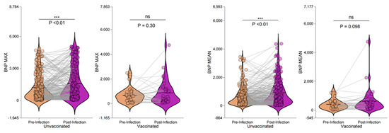 Pre- and post-infection changes in BNP levels in unvaccinated and vaccinated hemodialysis patients. “ns” indicates no significant difference between the groups, “***” indicates a p-value less than 0.01.
