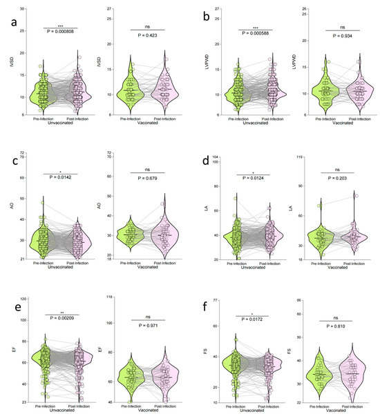 Changes in echocardiographic parameters before and after COVID-19 infection in maintenance hemodialysis patients, comparing vaccinated (CoronaVac) and unvaccinated groups. The panels show changes in interventricular septal thickness (IVSD, a), left ventricular posterior wall thickness (LVPWD, b), aortic root diameter (AO, c), left atrial diameter (LA, d), ejection fraction (EF, e), and fractional shortening (FS, f). Green indicates pre-infection, and purple indicates post-infection. Left panels represent the unvaccinated group, and right panels the vaccinated group. Statistical significance is denoted by * p < 0.05, ** p < 0.01, *** p < 0.001, and ns (not significant).