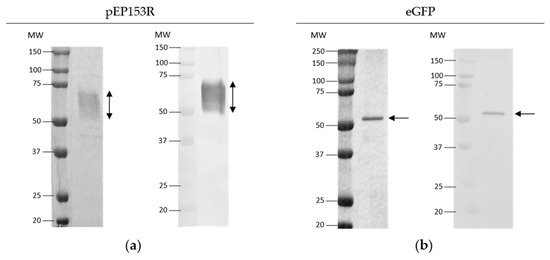 Analysis of the purified recombinant proteins. (a) pEP153R; (b) eGFP. In each case, the left panel shows the analysis by SDS-PAGE with Coomassie staining, and the right panel shows the analysis by immunoblotting using a mouse monoclonal antibody against the tag of each protein. Arrows indicate the band corresponding to the protein of interest. The numbers on the left side of the gels indicate the molecular weight (MW) of each band in the protein ladder (kDa).