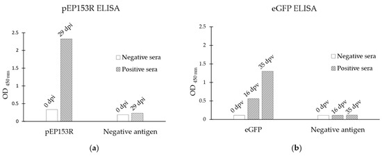 Analysis of the antigenicity of the target proteins by indirect ELISA: (a) pEP153R, using negative and positive serum samples from a domestic pig infected with Lv17/WB/Rie1; (b) eGFP, analysing negative and positive serum samples from a domestic pig vaccinated with Lv17/WB/Rie1-ΔEP153R. In each graph, the y-axis shows the optical density (OD) obtained in the assay, and the x-axis indicates the antigen coated on the plate. dpi/dpv: days post-infection/vaccination.