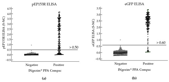 Interactive dot diagram (ROC analysis) for the indirect ELISAs: (a) ELISA pEP153R; (b) ELISA eGFP. The horizontal line indicates the cut-off value for each assay (S-NC > 0.50 and S-NC > 0.60, respectively). S-NC: sample OD minus the OD of the negative control of the assay.
