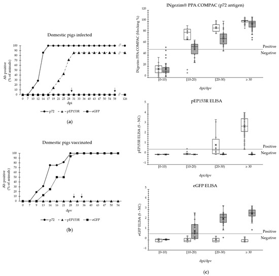 Analysis of the antibody (Ab) response in domestic pigs against the antigens p72 (INgezim® PPA Compac), pEP153R (pEP153R ELISA), and eGFP (eGFP ELISA). (a) Animals infected with Lv17/WB/Rie1; (b) animals vaccinated with different prototype vaccines; (c) data classified by ELISA, from infected (white boxes) or vaccinated (grey boxes) animals. The cut-off of each assay is indicated by a horizontal line. In (a,b), the y-axis shows the percentage of Ab-positive animals in each assay; and in (c), the ELISA blocking percentage or S-NC parameter. In all cases, the x-axis indicates the days post-infection/vaccination (dpi/dpv). The arrows indicate the day on which the animals were challenged (at 30, 35, or 58 dpi/dpv).