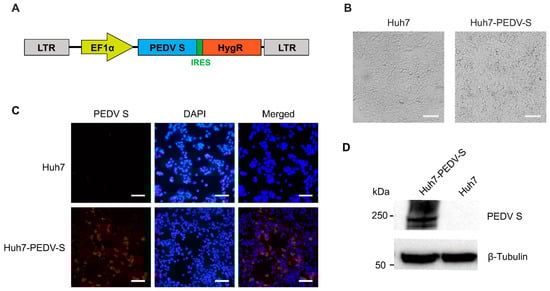 Huh7 cells were seeded at a density of 2 × 105 per well in six-well plates. Twelve hours after seeding, about 5 MOIs (multiplicities of infection) of lentivirus LV-EF1a-PEDV-S-IRES-Hygro supplemented with 8 μg/mL polybrene were used to transduce the cells. At 48 after transduction, cell culture medium containing 500 μg/mL hygromycin B (Roche, cat#: 10843555001, Shanghai, China) was added. The medium was changed every 2–3 days to select for positive cells. The monoclonal cells were isolated through limited dilution in 96-well plates. The expression of the PEDV S protein was subsequently verified via Western blotting, and the best overexpressing cell lines were selected for subsequent experiments.
