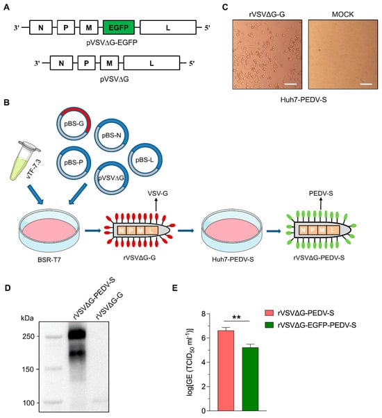 Generation of rVSVΔG-PEDV-S in the Huh7-PEDV-S cell line. (A) Schematic illustration of rVSV vectors used in this study. Upper panel: rVSV∆G-EGFP vector; lower panel: rVSV∆G vector. (B) Schematic representation of the generation process for the rVSV∆G-PEDV-S vaccine. BSR-T7 cells were infected with 1 MOI (multiplicity of infection) of vTF-7.3 virus and then co-transfected with pVSVΔG and VSV-system accessory plasmids: pBS-G, pBS-N, pBS-L, and pBS-P; Ninety-six hours after transfection, the supernatant containing rVSVΔG-G virus was collected and filtered to remove the residual vTF-7.3 virus. Subsequently, Huh7-PEDV-S cells were infected with the supernatant from the primary transfection to generate rVSV∆G-PEDV-S virus. (C) Morphology of Huh7-PEDV-S cells infected with the supernatant of the primary transfection or the MOCK treatment (DMEM medium) at 10× magnification. Scale bar: 100 μm. (D) rVSV∆G-PEDV-S virus was purified by centrifugation through 20% sucrose, and the pelleted virions were then suspended in PBS. The S protein within rVSV∆G-PEDV-S virus was analyzed by Western blotting. (E) The comparison of the titers of EGFP(+) and EGFP(−) rVSVs in the Huh7-PEDV-S cell line. The data are presented as log-transformed genome equivalents (GE, half-maximal tissue-culture infectious dose (TCID50)) per ml. values. The red bar represents rVSVΔG-PEDV-S, while the green bar represents rVSVΔG-EGFP-PEDV-S. Error bars indicate standard deviations (SDs). **, p < 0.01.