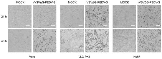 To evaluate the infectivity of rVSVΔG-PEDV-S in PEDV susceptible cell lines, Vero, Huh7, and LLC-PK1 cells were exposed to equivalent amounts of the rVSVΔG-PEDV-S virus. Following infection, all three cell lines exhibited clear CPE characteristic of VSV infection. These effects included cell rounding, detachment from the culture surface, and shrinkage, which progressed to extensive cell lysis over time. The onset and severity of CPE varied among the cell lines, with Vero cells showing the most rapid and pronounced morphological changes, followed by Huh7 and LLC-PK1 cells (Figure 3). These results demonstrate that rVSVΔG-PEDV-S can efficiently enter PEDV-susceptible cell lines, inducing characteristic CPE. This highlights the utility of the PEDV S pseudotyped rVSV as a robust tool for studying PEDV entry and host cell interactions in vitro.