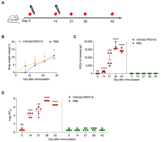 rVSVΔG-PEDV-S induces immune response against PEDV in BALB/c mice. (A) Mouse experimental schedule: Four-week-old BALB/c female mice (n = 5 for each group) were intramuscularly (IM) immunized with 1 × 108 TCID50 of rVSV∆G-PEDV-S, followed by a booster immunization with the same dose 14 days later. (B) Changes in body weight of the vaccinated mice receiving PBS (n = 5) compared to those vaccinated with rVSV∆G-PEDV-S (n = 5) are presented. (C) Specific immunoglobulin G (IgG) antibodies binding to PEDV-S1 were quantified using enzyme-linked immunosorbent assay (ELISA). (D) Neutralizing antibody titers (NT50) against rPEDV SD-EGFP were determined through a neutralization assay and calculated using the Reed–Muench method. Statistical significance between the rVSVΔG-PEDV-S and PBS groups was assessed using a one-way ANOVA Kruskal–Wallis test. ns, not significant; **, p < 0.01; ***, p < 0.001; ****, p < 0.0001.