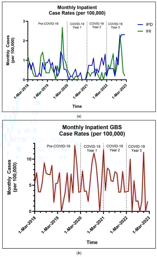 (a) Monthly rates of invasive pneumococcal disease and invasive Haemophilus influenzae. (b) Monthly rates of Group B Streptococcus.
