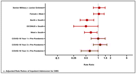 There were 165 unique cases of neonatal GBS reported during the study period (Table 2b). The monthly cases and rates per 100,000 infants less than six months are depicted in Figure 1b. There is a non-statistically significant trend towards increased cases of GBS in both Years 1 and 2 of the COVID-19 pandemic, with the highest number of cases being found in Year 2. Interestingly, there was a significant statistical difference during Year 3, showing a decrease in GBS-related hospitalizations when compared to the pre-pandemic baseline with an adjusted RR of 0.62 (95% CI: 0.38, 0.99), which is depicted in the forest plot in Figure 2c.