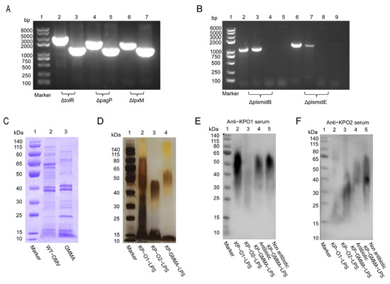 Generation of K. pneumoniae gene-mutated strains and co-expression of O1 and O2 serotype polysaccharides. (A) PCR identification of tolR, pagP, and lpxM gene knockout. Lane 1: DNA marker; lanes 2, 4, 6: PCR amplification result of wild-type strain; lanes 3, 5, 7: PCR amplification result of mutant strain. (B) PCR identification of elimination of plasmids B and E. Lane 1: DNA marker; lanes 2, 3, 6, and 7: PCR amplification result of wild-type strain; lanes 4, 5, 8, and 9: PCR amplification result of mutant strain. (C) Characterization of protein variations between WT-OMV and GMMAs via Coomassie brilliant blue staining. (D) Verification of expression of GMMA polysaccharides through silver staining. (E,F) Employment of whole-cell antibodies of anti-KP-O11 (K. pneumonia O1 serotype polysaccharides) and anti-KP-O2 (K. pneumonia O2 serotype polysaccharides) to ascertain expression levels of polysaccharides within GMMAs both in presence and absence of antibiotics.