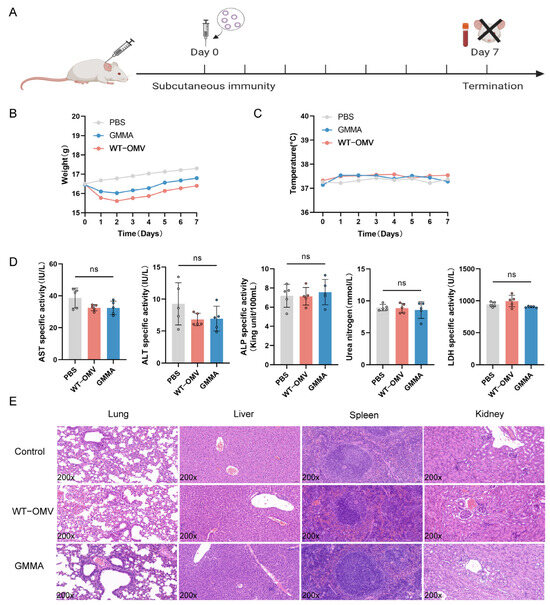 Biocompatibility of GMMA vaccine. (A) Single-immunization schematic diagram. (B) Single-immunization weight change. (C) Single-immunization temperature change. (D) Serum biochemical indicators after single immunization; n = 5. (E) Pathological changes in tissues of single-immunization mice. Differences between groups were tested using one-way ANOVA. ns p > 0.05.