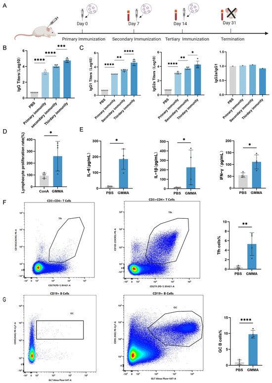 Mice were subjected to subcutaneous immunization with 5 μg of GMMA on days 0, 7, and 14. Subsequent analyses were conducted to evaluate the humoral and cellular immune responses induced by GMMAs (Figure 4A). Finally, the serum IgG antibody titers in the immunized mice were quantified using ELISA (Figure 4B). To assess the polarization of the immune response towards a Th1 or Th2 profile, we analyzed the antibody subtypes IgG2a and IgG1 and calculated their respective ratios. As depicted in Figure 4E, the IgG2a-to-IgG1 ratio was approximately 1, suggesting a balanced systemic IgG1/IgG2a response induced by the GMMA vaccine, which implies the simultaneous activation of both Th1 and Th2 immune responses (Figure 4C). Furthermore, splenic lymphocytes from the mice were harvested and stimulated with GMMAs as an antigen, promoting the proliferation of antigen-specific lymphocytes (Figure 4D). Concurrently, the supernatant from the stimulated splenic lymphocytes was collected to measure cytokine secretion levels, including for IL-6, IL-1β, and IFN-γ. The results demonstrated that cytokine levels were significantly elevated compared to the control group (Figure 4E). To facilitate a more comprehensive understanding of immune cell activation and proliferation, the inguinal lymph nodes from immunized mice were collected. Flow cytometry was subsequently utilized to assess the proportions of T follicular helper (Tfh) cells and germinal center B (GC B) cells both pre- and post-immunization. Notably, the quantity of Tfh cells increased fivefold compared to pre-immunization levels (Figure 4F), while the number of GC B cells exhibited a tenfold increase (Figure 4G). These findings support the conclusion that the GMMA vaccine is capable of inducing both humoral and cellular immune responses.