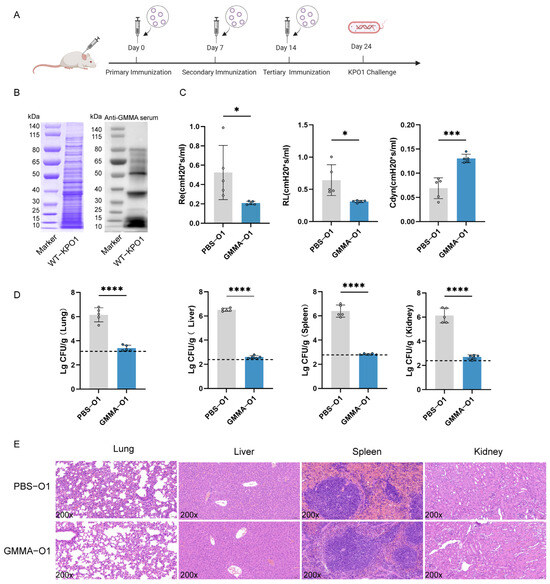 GMMAs triggered immune protection against O1 serotype K. pneumoniae. (A) Experimental flow chart for protection against O1 serotype K. pneumoniae by GMMAs. (B) KP-O1 whole bacterial protein was stained with Coomassie brilliant blue, and Western Blot analysis was performed on KP-O1 protein using last immune serum. (C) Analysis of lung resistance and lung compliance in mice infected with KP-O1 was conducted using small animal lung function analyzer. (D) Bacterial load in mouse organs. Limits of detection (LoD) were shown as dotted lines. (E) Analysis of pathological changes in tissues challenged with KP-O1. Data are presented as mean ± SD, and differences between two groups were tested using t-test. * p < 0.05, *** p < 0.001, **** p < 0.0001.