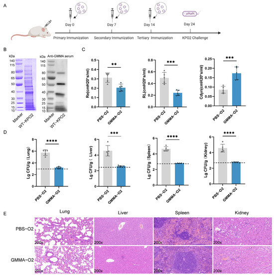 GMMAs triggered immune protection against O2 serotype K. pneumoniae. (A) Experimental flow chart of protection against for preventing O2 serotype K. pneumoniae by GMMAs. (B) KP-O2 whole bacterial protein was stained with Coomassie brilliant blue, and Western Blot analysis was performed on KP-O2 protein using the last immune serum. (C) Analysis of lung resistance and lung compliance in mice infected with KP-O2 was conducted using small animal lung function analyzer. (D) Bacterial load in mouse organs. Limits of detection (LoD) were shown as dotted lines. (E) Analysis of pathological changes in tissues of mice challenged with KP-O2. Data are presented as mean ± SD, and differences between the two groups were tested using a t-test. ** p < 0.01, *** p < 0.001, **** p < 0.0001.