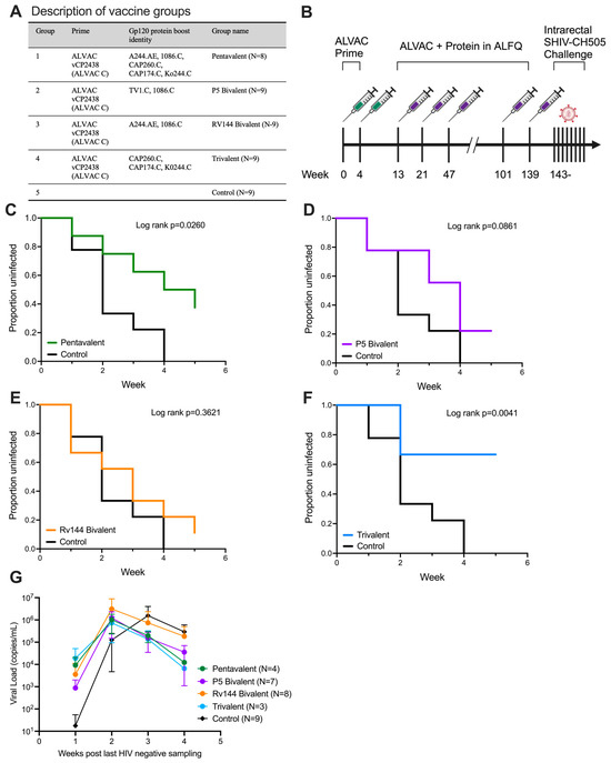 To assess whether immunogens computationally selected to provide additional V1V2 coverage could improve vaccine efficacy against a heterologous SHIV, we immunized four groups (n = 9) of Indian origin rhesus macaques (RM; Macaca mulata) with an ALVAC vCP2438 (ALVAC C) prime and gp120 protein boosts in ALFQ adjuvant consisting of (i) A244.AE, 1086.C, CAP260.C, Ko244.C, and CAP174.C (group 1; Pentavalent), (ii) TV1.C and 1086.C (group 2; P5 Bivalent), (iii) A244.AE and 1086.C (group 3; RV144 Bivalent), or (iv) CAP260.C, CAP174.C, and Ko244.C (group 4; Trivalent) (Figure 1A). RM were primed with ALVAC twice at 0 and 4 weeks and then initially boosted three times at weeks 13, 21, and 47. Due to the COVID-19 pandemic, the study was halted and reinitiated a year later when two additional boosts were given at weeks 101 and 139. This was followed by a weekly low-dose intrarectal challenge with the heterologous Tier-2 transmitted/founder SHIV-CH505, starting at week 143 (Figure 1B). Of note, 66.7% (6/9) of RM from the Trivalent group remained uninfected after five challenges, whereas only 37.5% (3/8) from the Pentavalent group, 2/9 (22.2%) from the P5 Bivalent group, and 1/9 (11.1%) from the RV144 Bivalent group remained uninfected. All animals in the control group became infected by the fourth immunization. This resulted in overall statistically significant protection per exposure compared to the control group (p = 0.0225, log-rank test). When comparing groups individually to the control arm, protection remained significant in the Trivalent and Pentavalent groups (p = 0.0041 and p = 0.0260, respectively) (Figure 1F,C) but not in either Bivalent group (Figure 1D,E). Among animals that became infected, there was no impact on peak viral load compared to the control animals (Figure 1G).