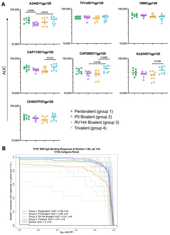 The breadth of V1V2 responses elicited by each vaccine at the time of challenge were also measured against a panel of 14 heterologous V1V2 gp70 proteins, representative of global HIV-1 diversity [30], which were used to generate area under magnitude and breadth curves (AUC-MBs) (Figure 2B). Comparing the AUC-MBs revealed similar breadth of responses across the four vaccine groups, except for the RV144 group, which had significantly lower V1V2 AUC-MBs than the P5 Bivalent group (p = 0.0055).