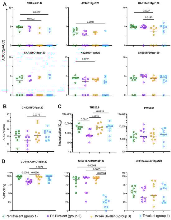 We next assessed the capacity of antibodies in sera to block binding of soluble CD4 or several monoclonal antibodies to the gp120 envelopes A244D11gp120 (CD4, A32, CH58, PG9, CH01, and 2G12), 6240 (CD4, PG9), and 902114B2gp140 (CH01). The only parameters with significant differences between groups were blocking of CD4 binding to A244D11gp120, where blocking by antibodies in the P5 Bivalent group (median = 81.6%) was significantly lower than the other three groups (medians = 97.6–100%; p = values 0.0002–0.0077), blocking of the anti-V2 non-neutralizing monoclonal antibody CH58 binding to A244D11gp120, where blocking by antibodies in the Trivalent group (median = 24.1%) was significantly lower than the other three groups (medians = 90.2–95.9%; p = values 0.00008–0.0005) (Figure 3D), and blocking of 2G12 to A244D11gp120, where the Pentavalent group (median = 36.2%) was significantly higher than the P5 Bivalent group (median = 28.1%, p = 0.0037) (Figure S1). Interestingly, blocking of the V2-targeting broadly neutralizing antibody CH01 also showed a higher trend in the Trivalent (median = 63%) and Pentavalent (median = 56.9%) groups compared to the Bivalent RV144 (median = 44.5%) and P5 Bivalent (median = 39.2%) groups (Figure 3D).