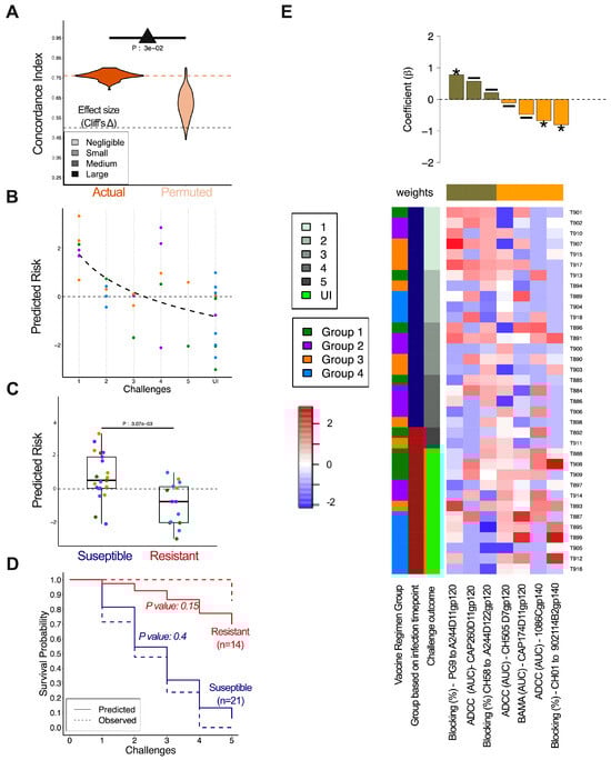 Immune feature profiles robustly predict protection. (A) Accuracy (Concordance Index) of risk predictions using actual versus permuted challenge outcome data across modeling replicates. Dotted orange and yellow lines indicate distribution means for actual and permuted dataset. Dotted black line indicates performance expected at random (0.0). Statistical significance was defined by Kolmogorov–Smirnov test (inset) and effect size by Cliff’s delta (color). (B) Scatterplot depicting the predicted relative risk of infection for each animal versus the challenge at which infection was observed for the representative model. The thick dotted line depicts the trendline. (C) Box plot showing the predicted relative risk of infection for animals in susceptible and resistant groups. Statistical significance was determined by Wilcoxon–Mann–Whitney test. (D) Kaplan–Meier graphs of observed (dotted line) and predicted risk group model (Cox PH, solid line) challenge outcomes learned from immune profiles for susceptible (blue, ≤4 challenges) and resistant (red, ≥5 challenges) groups. Significance between predicted and actual curves was defined by two-sided log-rank test. (E) Heatmap and feature coefficient plot of the filtered set of features (columns) and their contribution to the ‘final’ model (coefficients in bars; top panel). (Cox PH p-values: * p < 0.05; - p ≥ 0.05). Individual animals (rows) are ordered by time to infection and colored by vaccine group, relative susceptibility group, and time to infection (challenges). Features are centered and scaled with high responses indicated in red and low responses in blue.