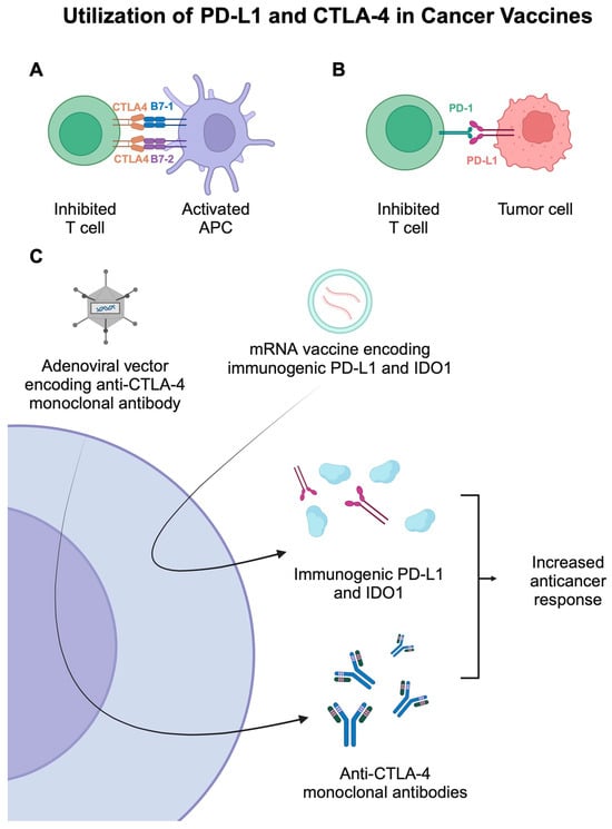 (A,B) Representation of mechanisms that suppress the activity of T cells. (C) The use of mRNA-based and adenovirus-based cancer vaccines that utilize immunogenic PD-L1 and mouse anti-CTLA-4 monoclonal antibodies. Created in BioRender. Kie&ðwski, K. (2025) https://BioRender.com/h84t864.
