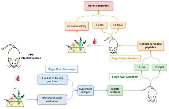 In this research, this approach involved infecting mice with PPV, followed by screening serum immune reactions using peptide arrays, ultimately leading to the identification of precise T and B shared-epitope peptides.
