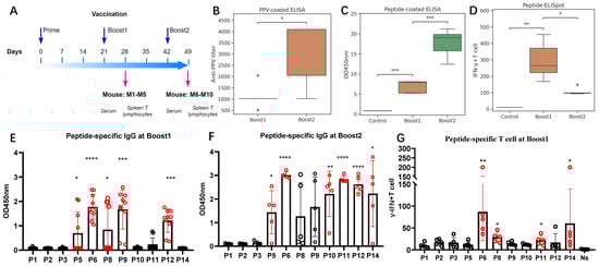 Given that the length of the P6 peptide is up to 50 amino acids (Table S1), we derived six sub-peptides based on their immunoreactivity score as depicted in Figure 2. These sub-peptides were administered to ten mice for immunization, following the strategy outlined in Figure 3A. For comparison, an additional ten mice were immunized with the full-length P6 peptide. The peptide-specific IFN-γ-secreting T-lymphocyte responses were assessed using Boost1 samples. Boost2 serum samples were analyzed using a peptide-coated ELISA.