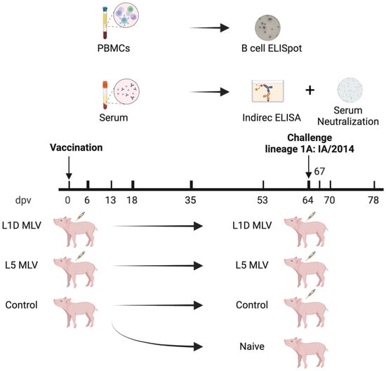 Timeline and experimental design. Pigs were either vaccinated with the respective modified live virus (MLV) vaccines or left unvaccinated, followed by a virus challenge (IA/2014) at 64 days post-vaccination (dpv). Thick ticks represent sample collections for both peripheral blood mononuclear cells and serum while the thin ticks represent sample collections for serum only. This figure was created with BioRender.com.