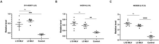 Relative levels of antibody responses in animals vaccinated with L1D or L5 vaccines, and controls, against PRRSV isolates from different lineages. Serum samples were collected at 64 days post-vaccination. (A) D11-052871 is a viral isolate belonging to lineage 5, (B) IA/2014 belongs to lineage 1A and (C) 46/2020 belongs to lineage 1C.5. Data were presented as mean ± SEM with individual values denoted by closed symbols. All optical density (OD450) values were normalized relative to a reference serum recognizing the corresponding antigen. ns = not significant; ** p < 0.01, *** p < 0.001, **** p < 0.0001, one-way ANOVA.