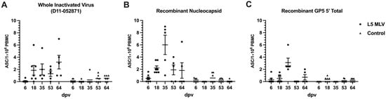 Frequencies of antigen-specific antibody-secreting cells (ASCs) in circulation were measured using PBMCs collected at different time points post-vaccination. As shown in Figure 4, frequencies of circulating ASCs specific to the whole virus (L5) and N protein starts to increase earlier than those to GP5, which is consistent with the pattern of antibody responses seen in the serum (Figure 3). Viral antigen-specific ASCs in circulation peaked at 35 dpv and returned to baseline by 64 dpv.